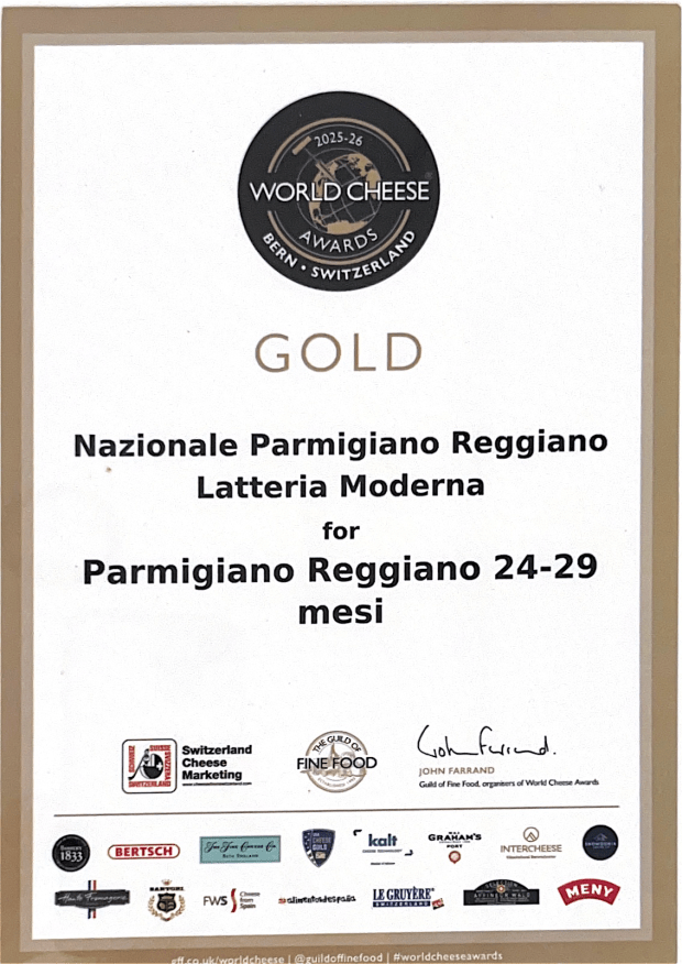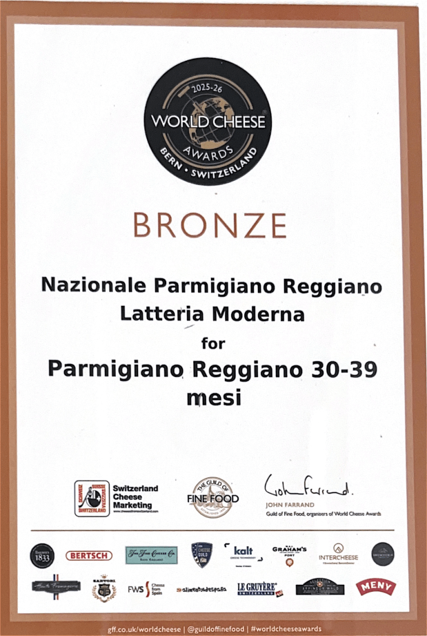 2025 World Cheese Award – Berna (Svizzera) – Latteria Sociale Moderna: gold per categoria 24-29 mesi e medaglia bronzo per categoria 30-39 mesi.